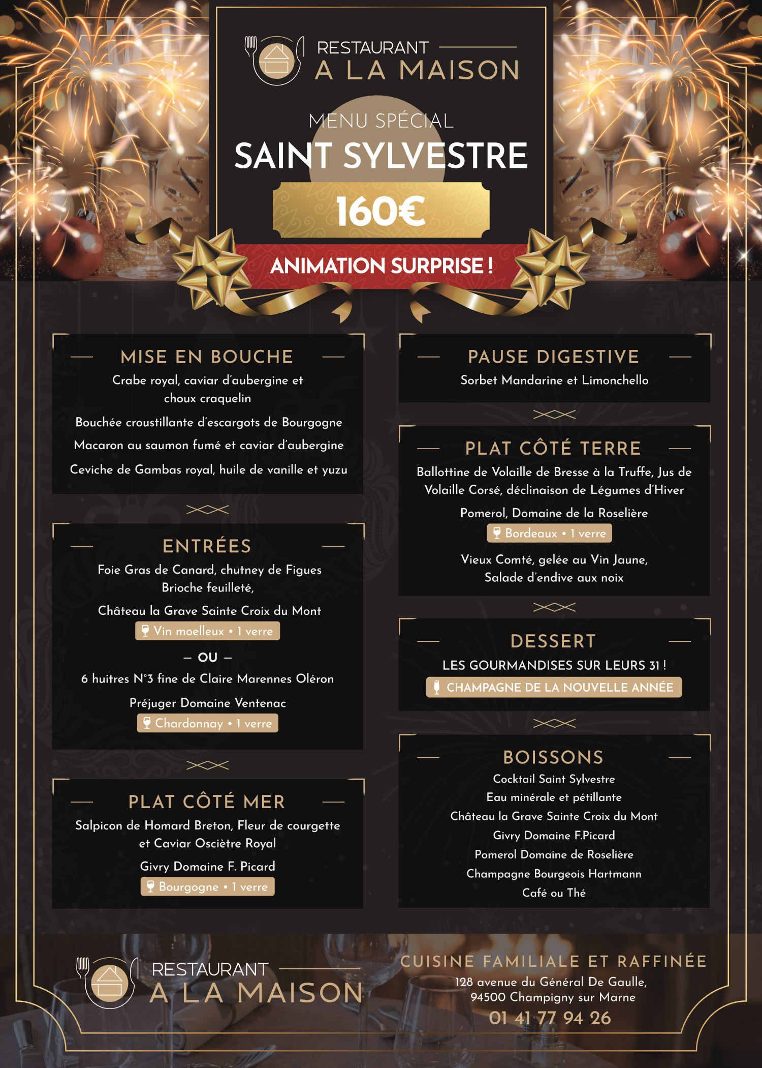 Pour fêter le réveillon du Jour de l'an, nous vous proposons un menu festif à déguster le mercredi 31 décembre.